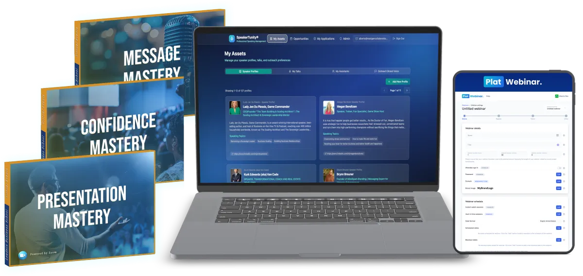 Over two days of live virtual intensive training, you will transform into a captivating speaker capable of effortlessly converting audiences. This event focuses on teaching you how to conduct and secure interviews, and how to craft and deliver a compelling signature talk that not only informs but also inspires action and secures new clients or opportunities.
